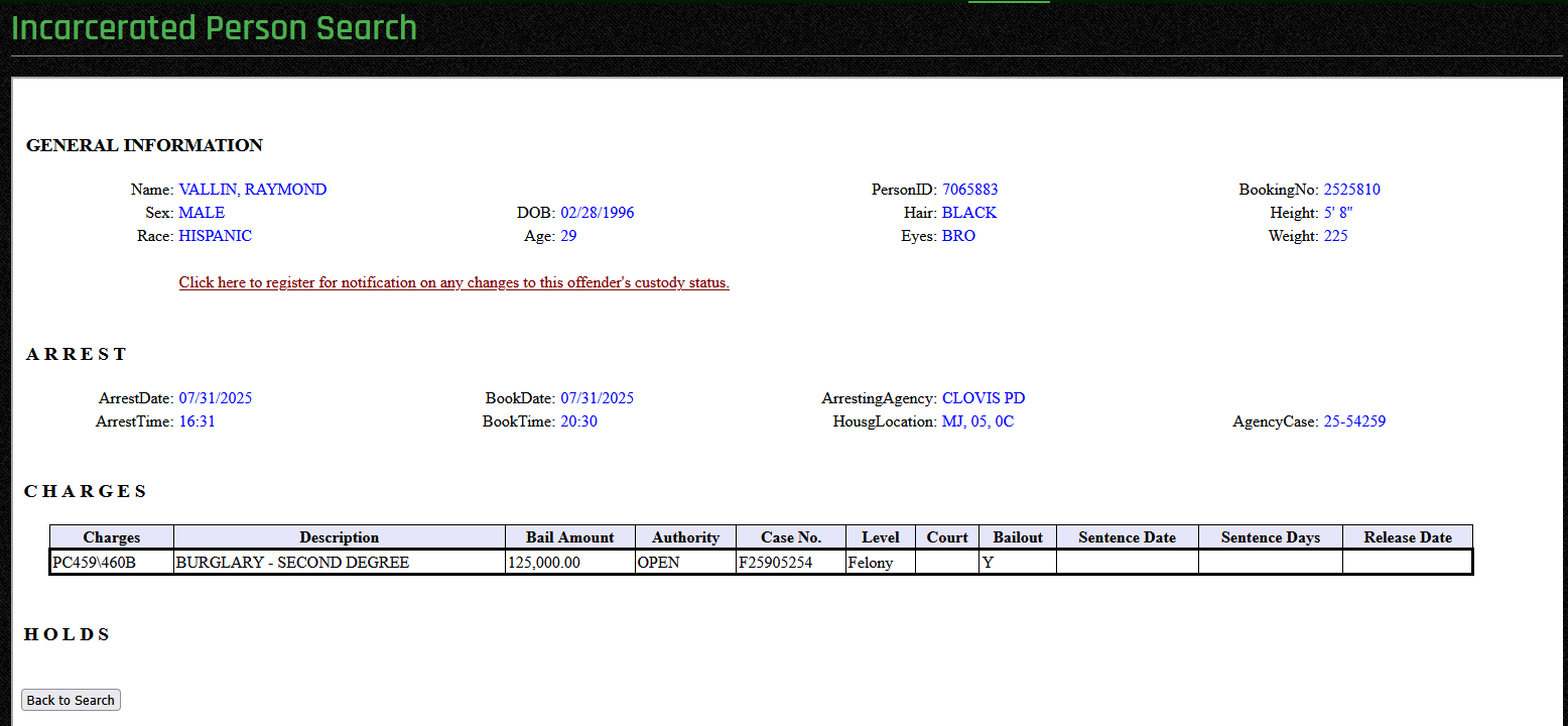 Clovis Arrest made in Clovis barbecue restaurant burglary Robert Graham August 12, 2025 https://fresnocrimewatch.com/wp-content/uploads/2025/08/Arrest-made-in-Clovis-barbecue-restaurant-burglary.mp4 Clovis Post navigation Previous: Teen arrested for shooting at central Fresno home, police sayNext: Auto-theft capital no more: Fresno Police Department’s special team targets car thieves Subscribe Login Notify of new follow-up comments new replies to my comments Label {} [+] Name* Email* Website Label {} [+] Name* Email* Website 1 Comment Oldest Newest Most Voted Inline Feedbacks View all comments Author Robert Graham 4 months ago See his booking information here. Author's Other Posts Suspect arrested in connection to shooting near VA hospital in central Fresno Suspect arrested in connection to shooting near VA hospital in central Fresno March 13, 2026 0 Man arrested in connection to shooting at Amtrak station in Downtown Fresno Man arrested in connection to shooting at Amtrak station in Downtown Fresno March 13, 2026 0 Teen arrested after crashing parents’ vehicle into Northeast Fresno Macy’s Teen arrested after crashing parents’ vehicle into Northeast Fresno Macy’s March 12, 2026 0 Charges filed against woman accused of deadly hit and run crash in Parlier Charges filed against woman accused of deadly hit and run crash in Parlier March 12, 2026 0 Related Stories Clovis Students released after hoax call locked down 3 Clovis schools Robert Graham March 9, 2026 0 Clovis Clovis man pleads to selling fentanyl that killed young woman Robert Graham March 3, 2026 0 Clovis Multiple suspects wanted in robbery at Clovis Kay Jewelers Robert Graham February 11, 2026 0 Clovis Woman leads police on slow-speed chase in Clovis Robert Graham January 8, 2026 0 Clovis Suspected DUI driver hits 5-year-old, mom near Clovis Trader Joe’s Robert Graham January 5, 2026 0 Clovis Family seeks justice for beloved Clovis educator after violent attack Robert Graham December 19, 2025 0 Murder 41-year-old man stabbed to death by roommate after argument 1 41-year-old man stabbed to death by roommate after argument February 25, 2026 0 2 men arrested in Fresno’s first homicide of 2026 2 2 men arrested in Fresno’s first homicide of 2026 February 4, 2026 0 19-year-old man shot and killed in central Fresno identified 3 19-year-old man shot and killed in central Fresno identified January 27, 2026 0 Man in central Fresno shooting dies from injuries, identified 4 Man in central Fresno shooting dies from injuries, identified January 19, 2026 0